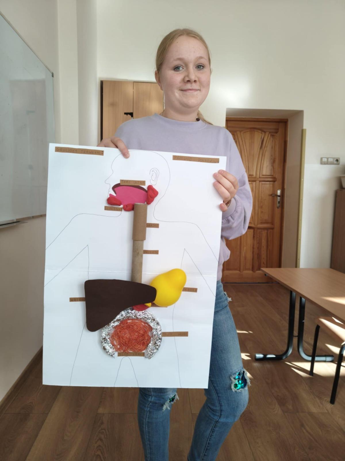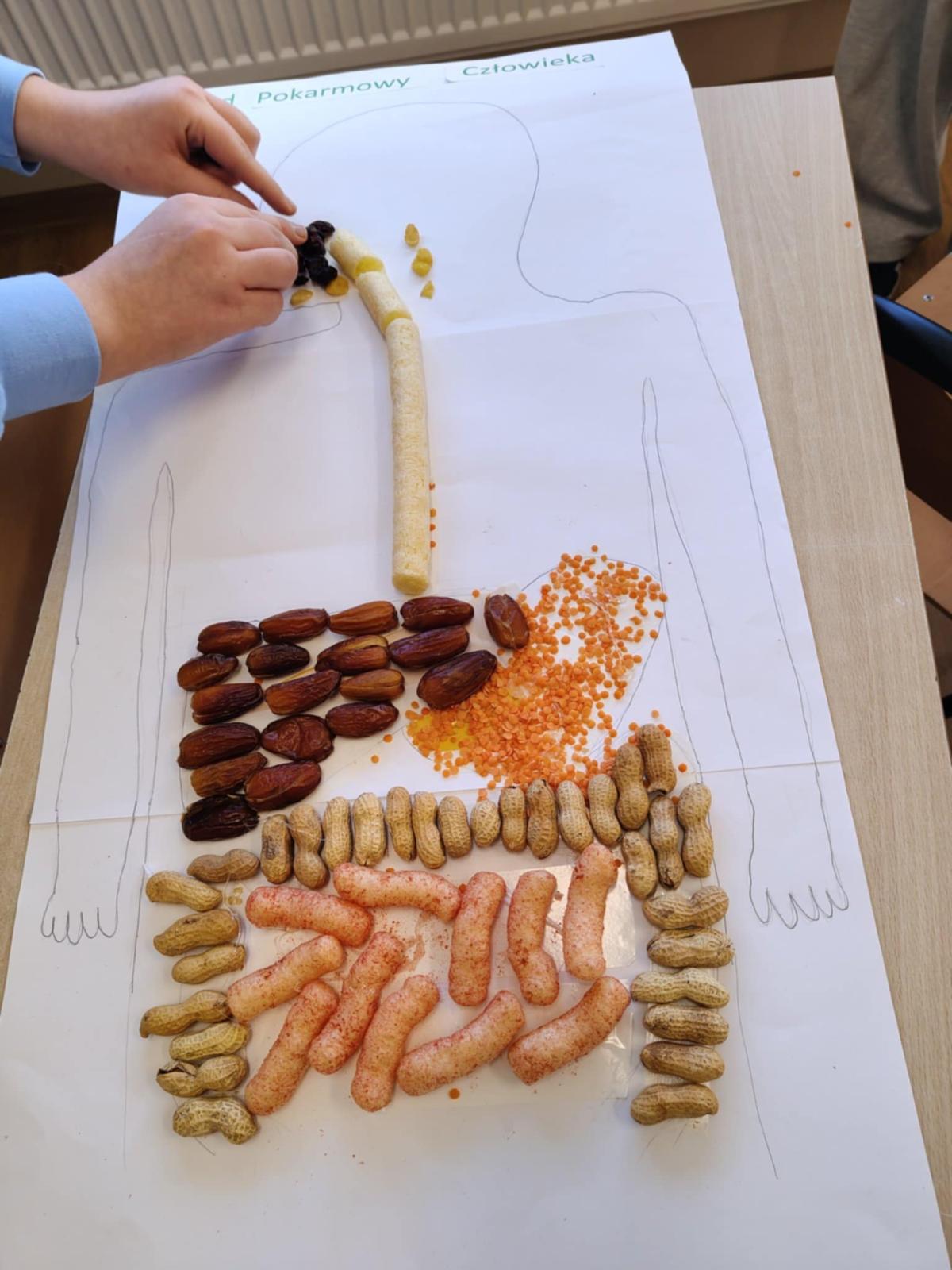 z uczniów z zaangażowaniem odwzorowywał najważniejsze narządy, takie jak jama ustna, przełyk, żołądek czy jelita, wykorzystując różnorodne materiały plastyczne. Po zakończeniu pracy uczniowie prezentowali swoje model, wskazując poszczególne elementy układu omawiając ich funkcje. Dzięki praktycznym działaniom uczniowie nie tylko lepiej zrozumieli, jak działa nasz organizm, ale również rozwijali samodzielnie, kreatywność i umiejętność prezentowania swojej pracy.