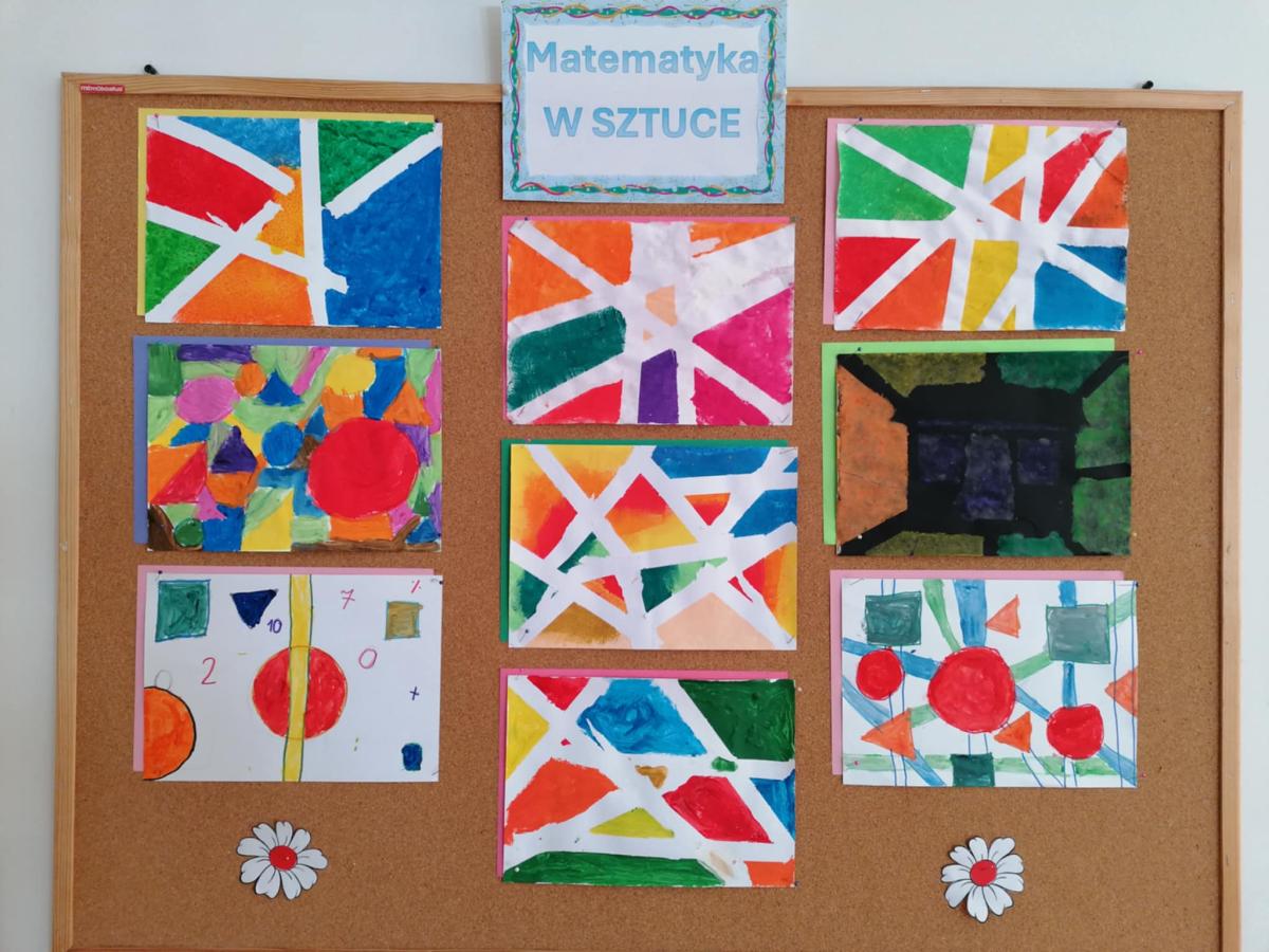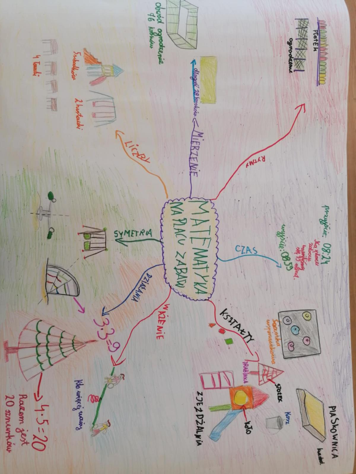 Efektami pracy były: notatka wizualna, w której uczniowie przedstawili odkryte przez siebie matematyczne aspekty przestrzeni zabaw oraz dzieła plastyczne zawierające wybrane elementy matematyki.