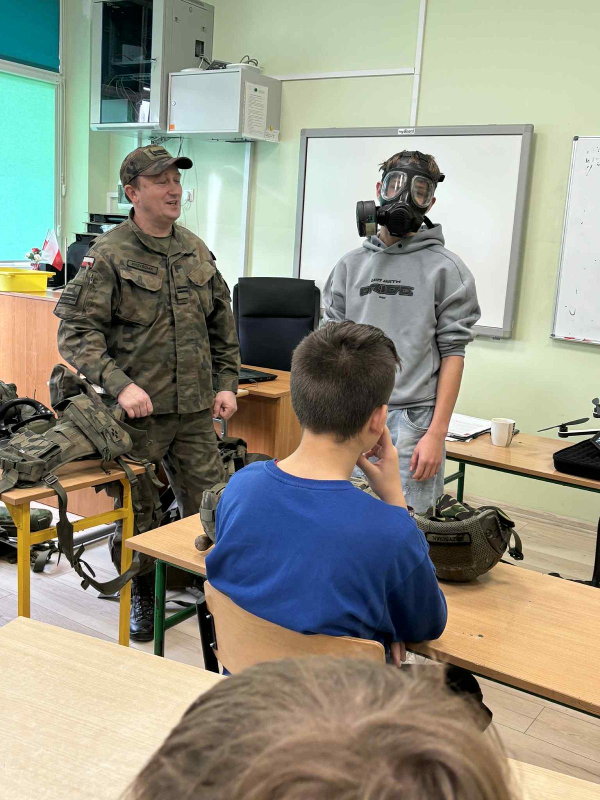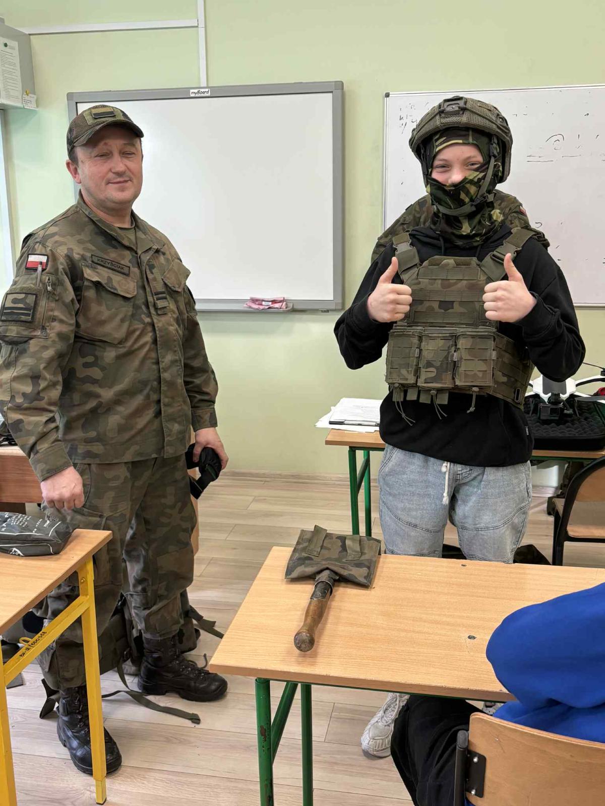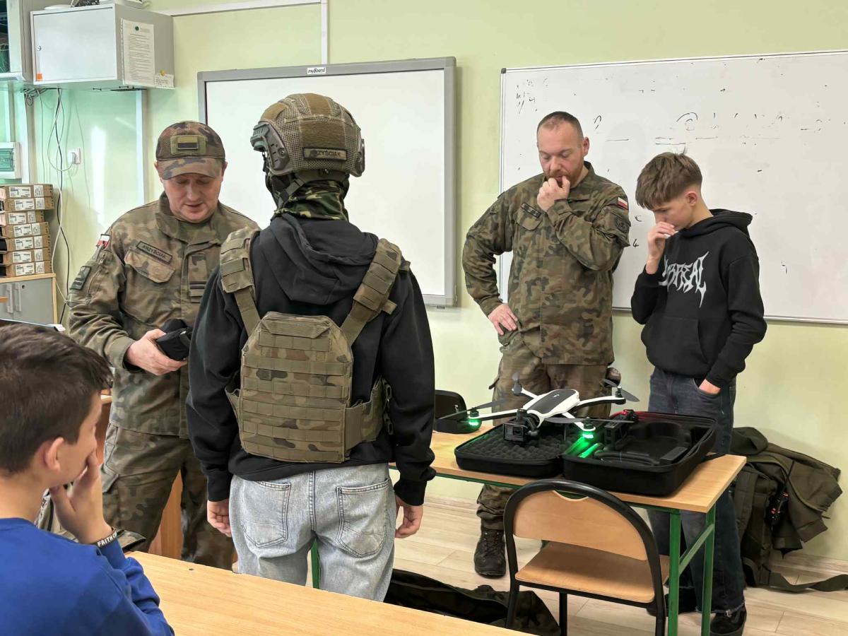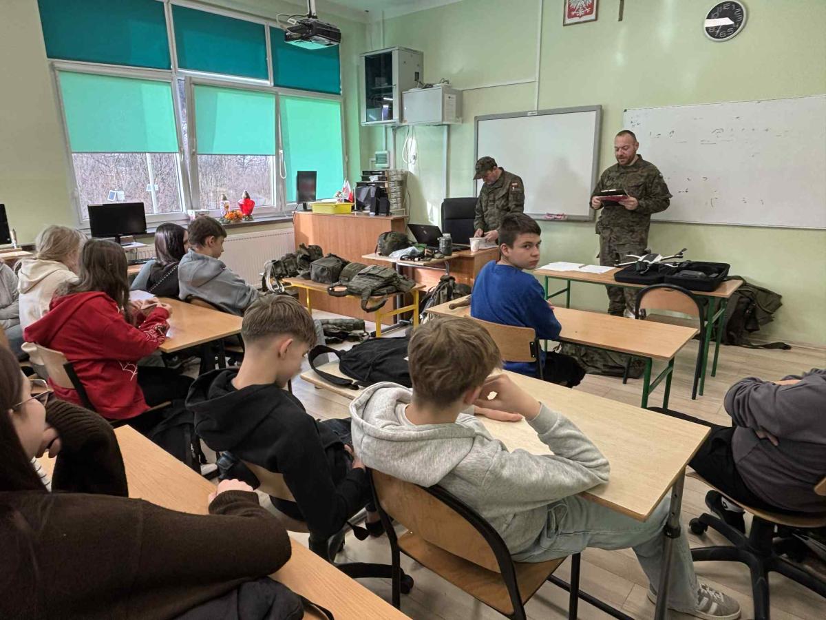 Dzisiejsze zajęcia w naszej szkole w ramach programu „Edukacja z wojskiem” poprowadzili żołnierze Wojsk Obrony Terytorialnej. Uczniowie klas 7–8 wzięli udział w 3-lekcyjnym szkoleniu łączącym teorię z praktyką, podczas którego poznali zasady alarmowania, podstawy ewakuacji i schronienia oraz sposoby reagowania w sytuacjach kryzysowych. Młodzież uczyła się również udzielania pierwszej pomocy i właściwego postępowania w przypadku kontaktu z podejrzanymi, niezidentyfikowanymi przedmiotami. Dodatkową atrakcją była możliwość obejrzenia z bliska wyposażenia żołnierza – umundurowania, plecaka z ekwipunkiem oraz wojskowego drona wykorzystywanego do działań rozpoznawczych. Zajęcia były ciekawe, angażujące i spotkały się z dużym zainteresowaniem uczniów.