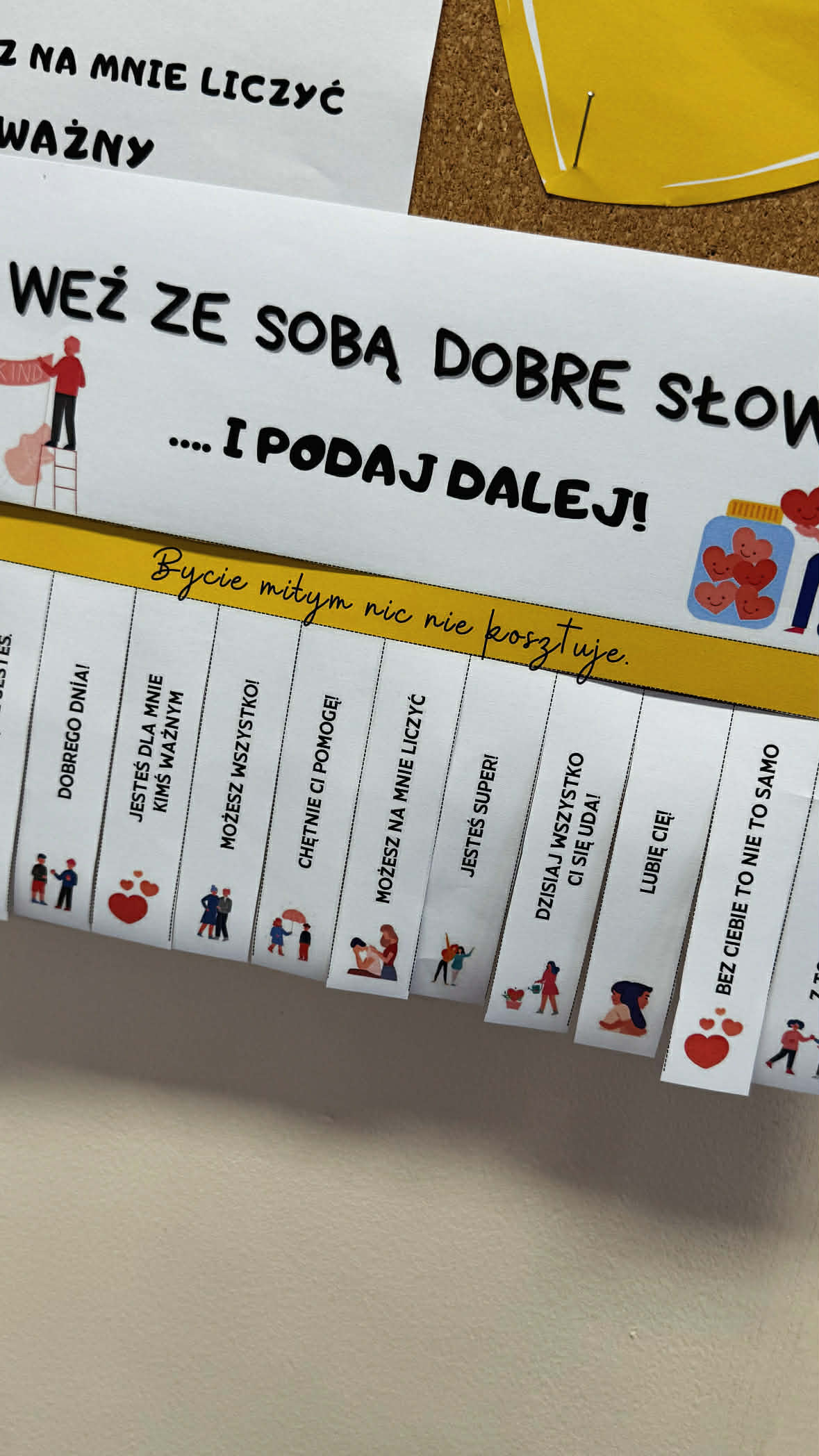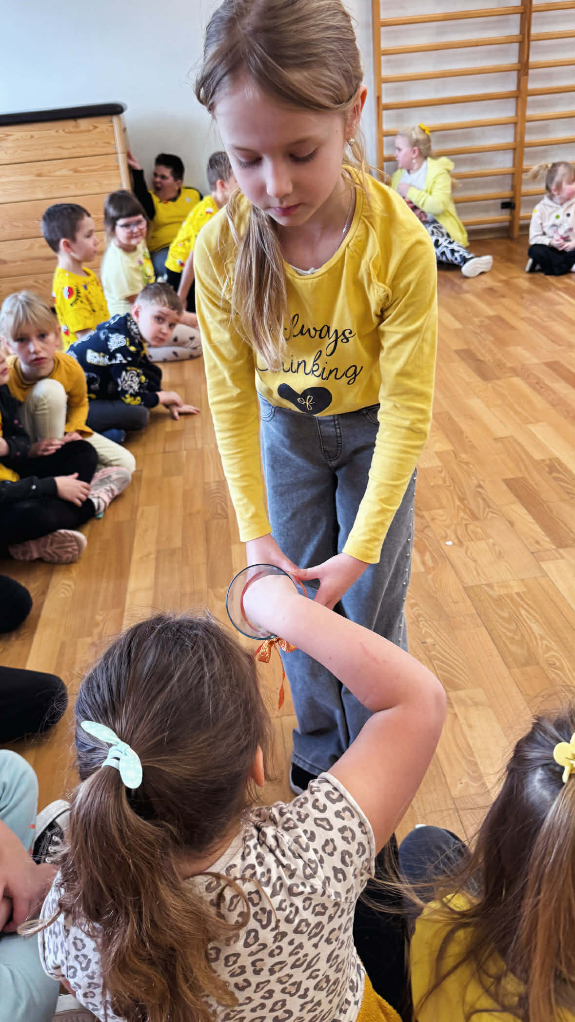 Samorząd Uczniowski zadbał także o starszych uczniów. W klasach IV–VIII uczniowie również mieli możliwość losowania miłych i życzliwych słów, które przypominały, jak ważne są drobne gesty i dobre słowo w codziennym życiu. Tego dnia cała społeczność szkolna włączyła się we wspólne świętowanie, ubierając się na żółto – kolor symbolizujący radość i życzliwość. Akcja została zorganizowana przez Samorząd Uczniowski wraz z opiekunem. Dziękujemy wszystkim za zaangażowanie i wspólne tworzenie atmosfery pełnej serdeczności!